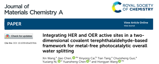 近日,z6com·尊龙微纳器件与材料物理团队―王红艳教授课题组在二维共价框架光催化全水解研究中取得重要研究进展,相关研究成果以“Integrating HER and OER Active Sites in a Two-Dimensional Covalent Terephthalaldehyde-based Framework for Metal-Free Photocatalytic Overall Water Splitting” 为题,发表在国际知名期刊 Journal of Materials Chemistry A(Q1,IF=9.5)上。J. Mater. Chem. A是英国皇家化学会旗下材料化学领域的旗舰期刊,专注于报道在能源生产、存储、转化以及可持续发展方面具有突出应用前景的材料研究。该论文第一完成单位为z6com·尊龙,论文的第一作者为z6com·尊龙硕士研究生汪鑫,通讯作者为博士研究生陈娇与王红艳教授。