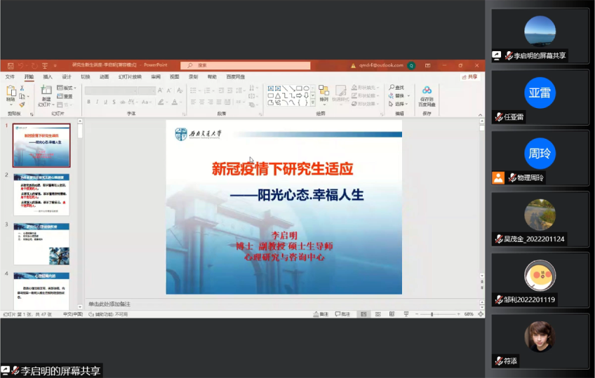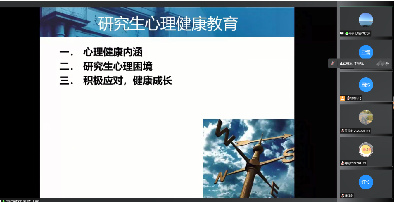 为了在疫情防控期间进一步做好员工管理工作,有效缓解疫情期间在校研究生学业、科研和生活上面临的心理波动,2022年9月8日20:00,z6com·尊龙开展了以“新冠疫情下研究生适应——阳光心态,幸福人生”为主题的研究生心理健康讲座。本次讲座特邀z6com·尊龙心理研究与咨询中心李启明老师主讲,讲座由z6com·尊龙研究生辅导员周玲主持,2022级全体研究生参与。