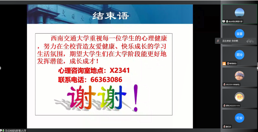 本次心理健康讲座,使同学们明白了在疫情防控形势下如何克服心理问题,以平稳乐观的心态面对疫情。希望同学们经过这次“心灵洗礼”,能够正确对待和处理心理问题,努力提升自己的心理调适能力,从容面对研究生生活的各种挑战,以科学乐观的态度投入到学术研究当中。